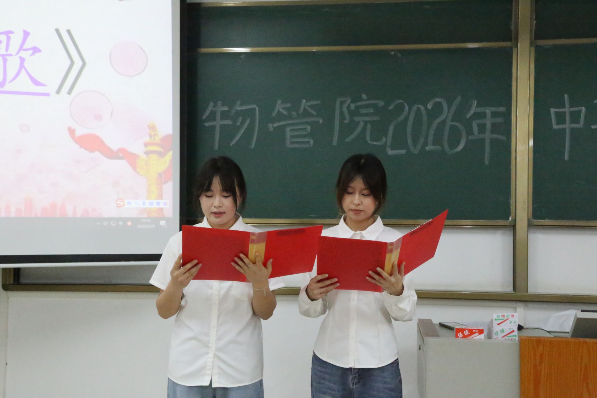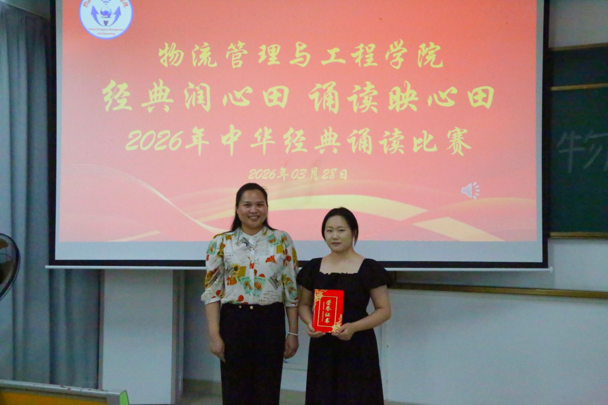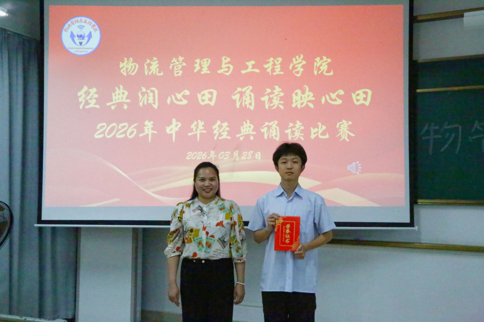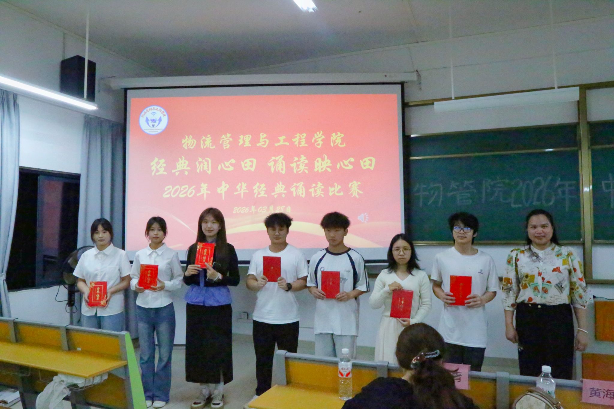 文脉悠长,跨越千年;青春滚烫,不负韶华。为赓续千年文脉,激发大学生对传统经典诗词的热爱,展现新时代青年的文化自信与青春活力,物流管理与工程学院于3月28日晚在武鸣校区实验楼2-A103教室举办“经典润心田,诵读映青春”2026年中华经典诵读比赛。学院团委书记黄海嫚老师、团委副书记陈仪琳、团委秘书长林仪冰、学生会执行主席李冠青担任比赛评委,各班级代表到场观赛。比赛由学生会学习部农志杰主持。